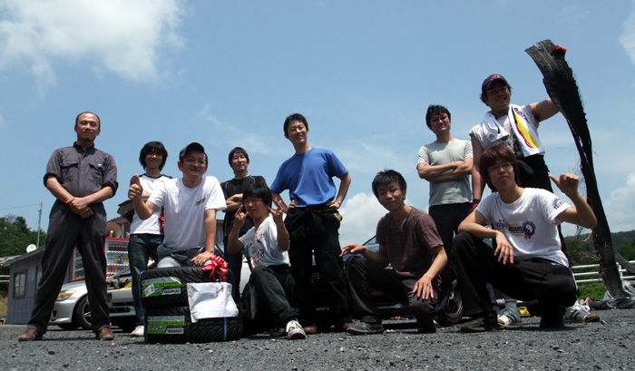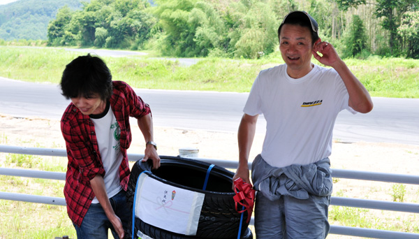 参加者とサプライズのタイヤに座る会長(笑)