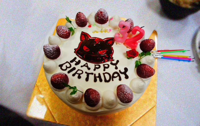 バースデーケーキケーキの登場!倶楽部の猫キャラとローソクは『32』です。